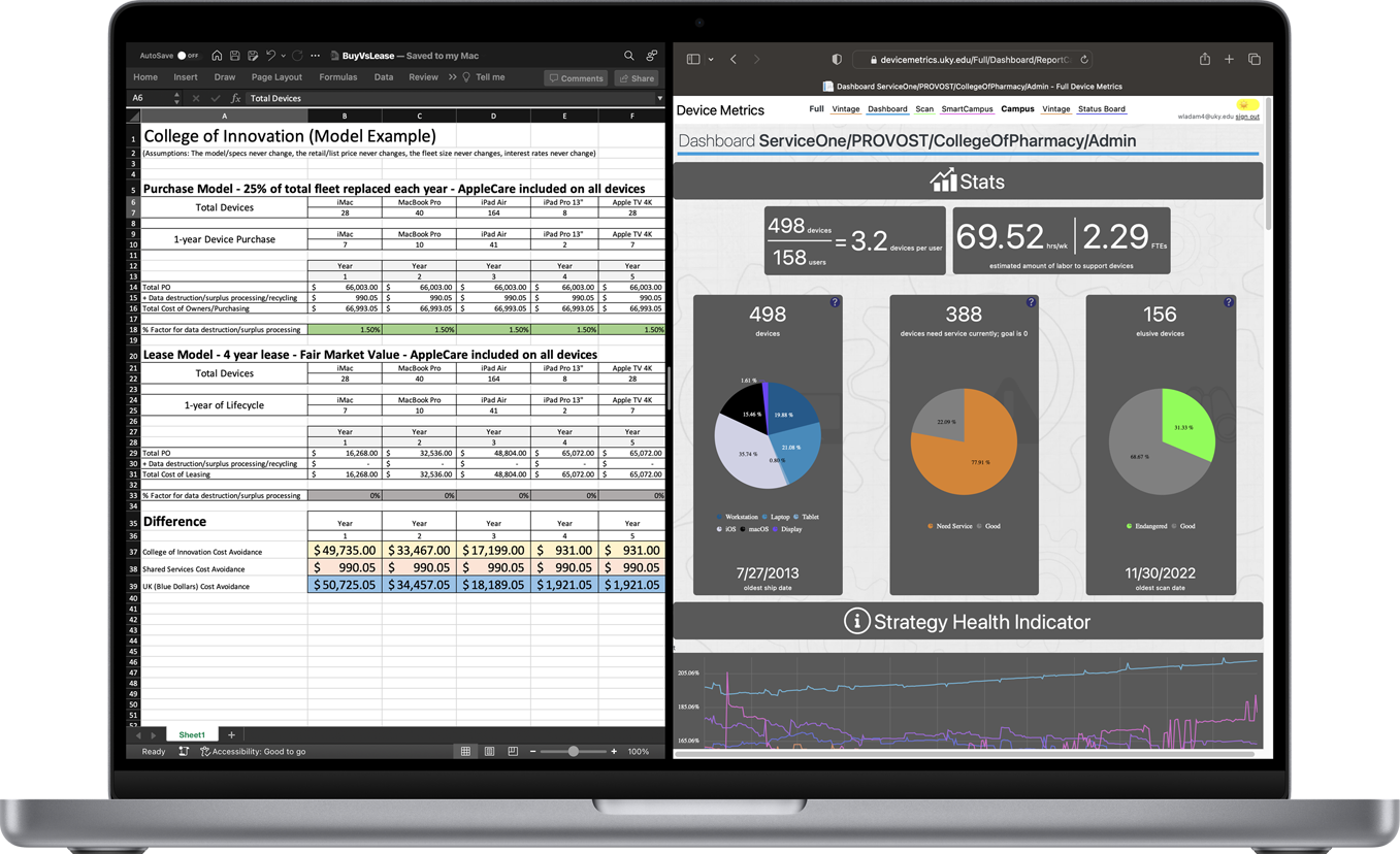 MacBook Pro. From crunching numbers to visualization, Mac performance powers Adams’ analysis. Split View elegantly displays data in Excel alongside the University of Kentucky’s technology performance dashboard.