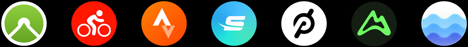 Featured apps: Komoot, MapMyRide, Strava, Swim.com, Peloton, AllTrails, Tides, MySwimPro, Gaia GPS, Nike Run Club, Palisades, Paddle Logger, Oceanic+, and Slopes.