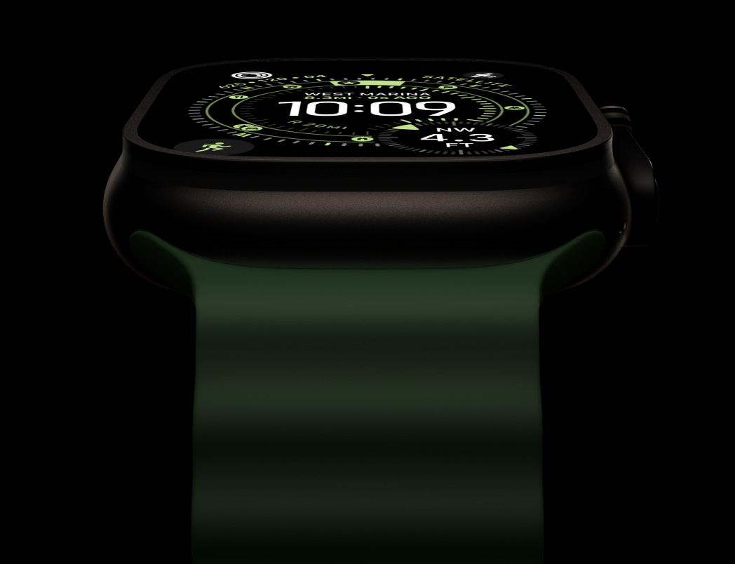 Apple Watch Ultra 3,  titanium case, natural color, compass on Orienteering watch face, Ocean Band, neon green color