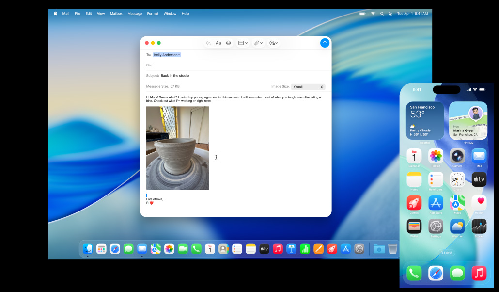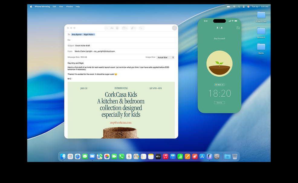 Com o Espelhamento do iPhone, você vê e controla seu aparelho no Mac5. Você consegue acessar todos os seus apps favoritos do iPhone, mesmo com o telefone carregando no outro lado da sala. As Atividades ao Vivo do iPhone também aparecem no Mac. Então, quando há uma atualização importante, como a chegada do seu Uber, você não precisa pegar o telefone para ficar sabendo. Dá até para arrastar e soltar um vídeo do Mac no iPhone e continuar editando onde estiver.