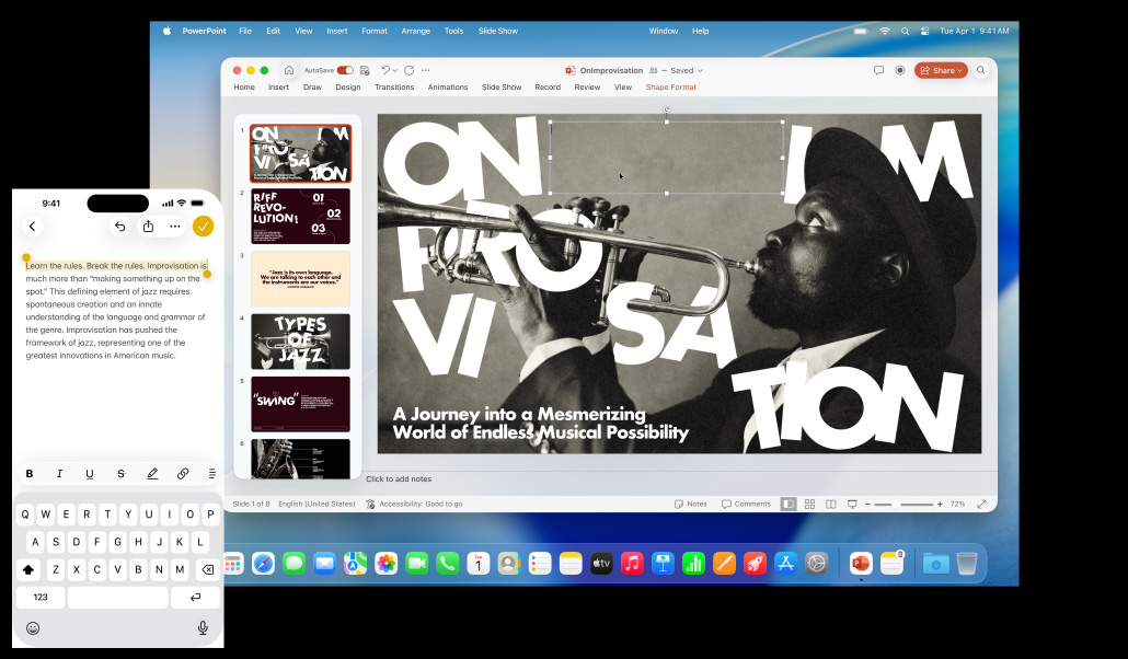 Imagine começar a escrever um e-mail no iPhone e poder terminar com calma no Mac. Ou iniciar um relatório no iMac e continuar no iPad a caminho da reunião. Com o Handoff, isso é possível — e descomplicado. Quando seu Mac e seu iPhone ou iPad estão próximos, você consegue alternar o que está fazendo entre eles4. Um ícone do último app que você usou aparecerá no segundo aparelho — no Dock do seu Mac e iPad ou no Seletor de Apps no iPhone. É só tocar ou clicar para continuar de onde parou, sem precisar procurar o arquivo. O Handoff funciona com Mail, Safari, Notas, Pages, Numbers, Keynote, Mapas, Mensagens, Lembretes, Calendário e Contatos. E quem desenvolve também pode incluir facilmente o Handoff nos seus apps.