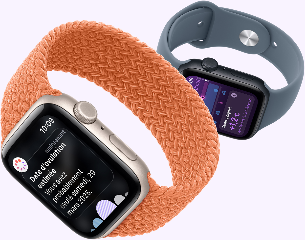 Grâce à ses capteurs avancés, Apple Watch SE 3 peut mesurer la température de votre poignet quand vous dormez1. Les données recueillies permettent à l’app Suivi du cycle d’estimer la date de votre dernière ovulation, une info potentiellement utile pour la planification familiale9.