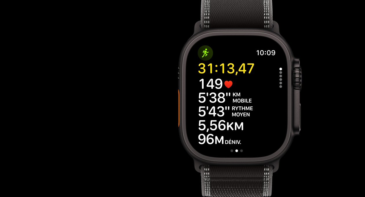 Aux adeptes de course : Apple Watch Ultra 3 est l’alliée tout indiquée pour maximiser vos entraînements et atteindre vos objectifs. Grâce à ses puissantes fonctionnalités comme le GPS bifréquence haute précision, des données avancées, les entraînements personnels et le nouveau Workout Buddy, elle vous propulse là où vous voulez aller. Et durant vos sorties avec votre Ultra 3, vous pouvez compter sur la 5G ultrarapide8.