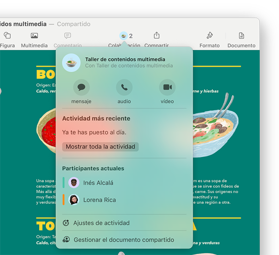 Colabora y comparte fácilmente archivos, carpetas, documentos y mucho más desde cualquier parte. Solo tienes que enviar un enlace privado y decidir quién puede ver, compartir o editar. Y como se actualiza en tiempo real, puedes comprobar los cambios sobre la marcha.