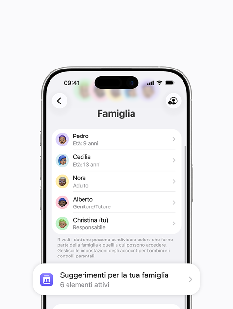 • Per indicazioni su come usare al meglio le funzioni per la famiglia, apri Impostazioni, tocca il tuo nome, quindi seleziona Famiglia e poi “Suggerimenti per la tua famiglia”.