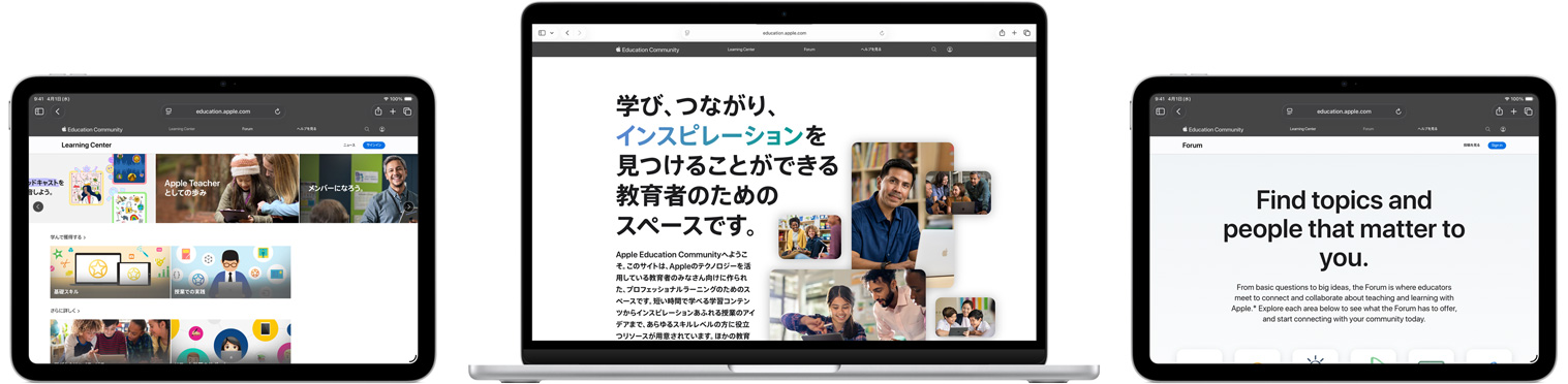 Appleのプロフェッショナルラーニングは、みなさんの学校のあらゆる場面で役立つリソースをオンラインまたは対面で提供しています。Appleと世界中の教育者のみなさんとの継続的なコラボレーションです。