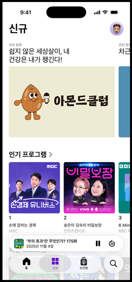 청취 중인 팟캐스트를 기반으로 당신의 취향을 저격할 콘텐츠를 추천해 줍니다. 마음에 쏙 드는 프로그램들을 그 어느 때보다 다채롭게 만나볼 수 있도록 말이죠.