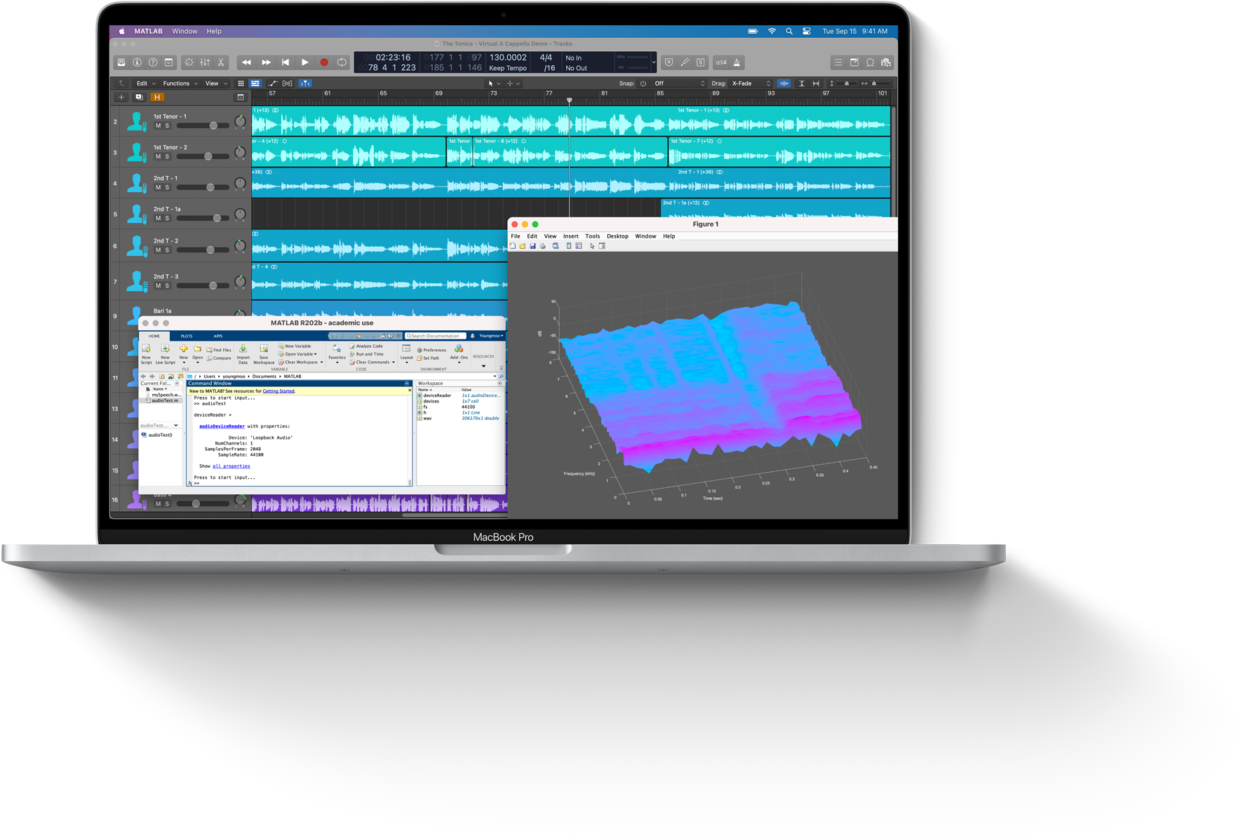 MacBook Pro. La Mac trabaja sin problemas con apps profesionales de música y visualización, como Logic Pro y MATLAB, y lleva a otro nivel la investigación en audición automatizada que el Dr. Kim realiza con instrumentos y robots creados por él mismo.