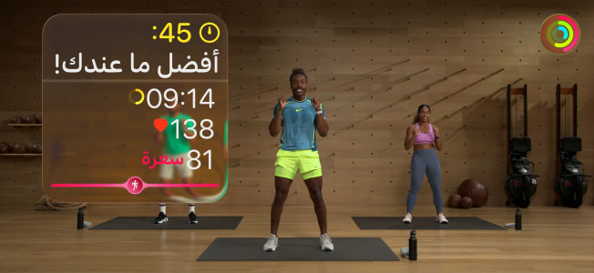 • عند استخدام +Fitness مع AirPods Pro 3 أو Powerbeats Pro 2، سترى قياسات شخصية في الوقت الفعلي على الشاشة، بما فيها معدل نبض قلبك والسعرات الحرارية التي تحرقها خلال التمرين. ويمكنك أيضاً رؤية هذه القياسات عند ارتداء جهاز مراقبة لمعدل نبض القلب من جهة خارجية ويكون موصولاً بجهازك. 1