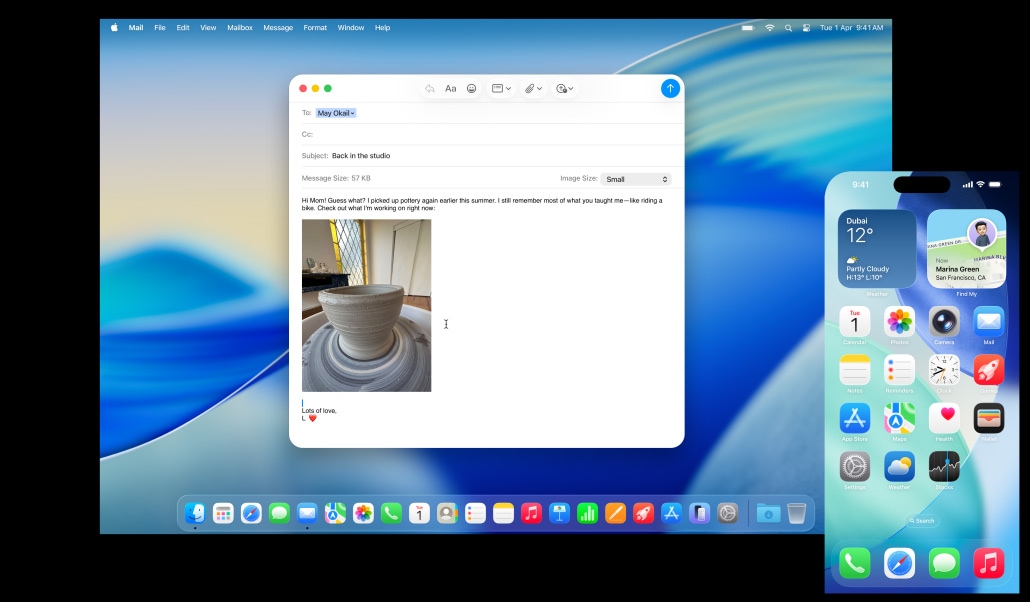 iPhone Mirroring lets you see and use your iPhone right from your Mac.5 So even if your phone is getting charged across the room, you can still access all your favorite iPhone apps. Live Activities from your iPhone also appear on your Mac. So when timely events occur, you don’t have to reach for your phone to stay in the know. You can even drag and drop a video from your Mac to your iPhone, so you can continue editing on the go.