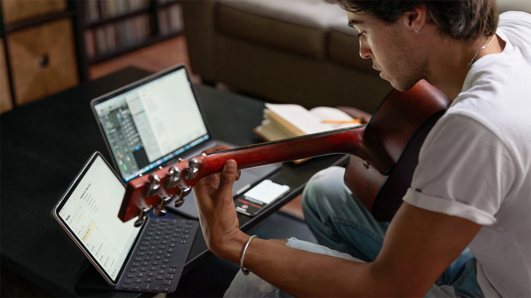 As a singer and songwriter, Max says inspiration can come at any time, and he needs to be ready. He uses Voice Memos on iPhone to capture song ideas in the moment, then picks them up on Mac to bring them to life in different arrangements.